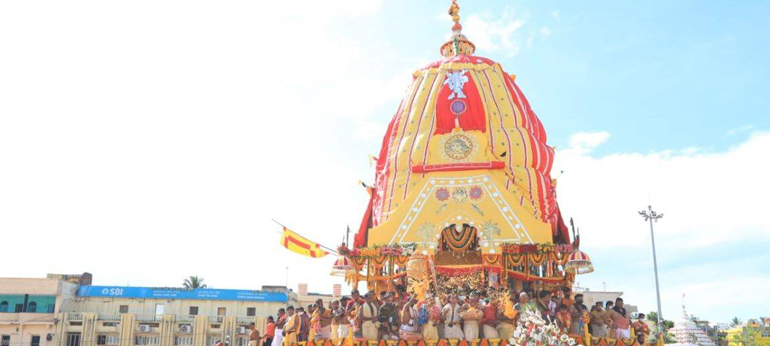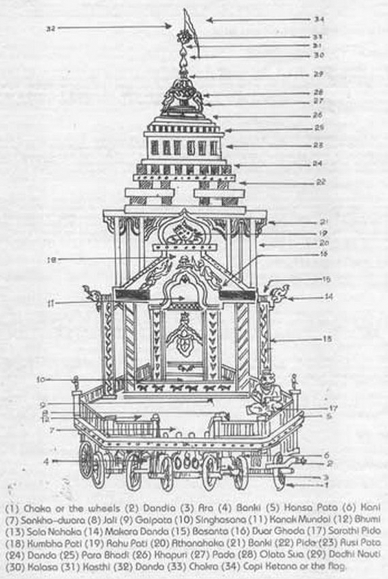 Presiding Deties: Shree Jagannath Number of wheels: 16 Total Number of wooden pieces used: 832 Height: 44' 2" Length and breadth: 34' 6" x 34' 6" Wrappings: Red, Yellow colour cloths Guarded by: Garuda Name of the charioteer: Daruka The flag: Trailokyamohini The horses: Shankha, Balahaka, Suweta, Haridashwa The rope: Sankhachuda Naguni